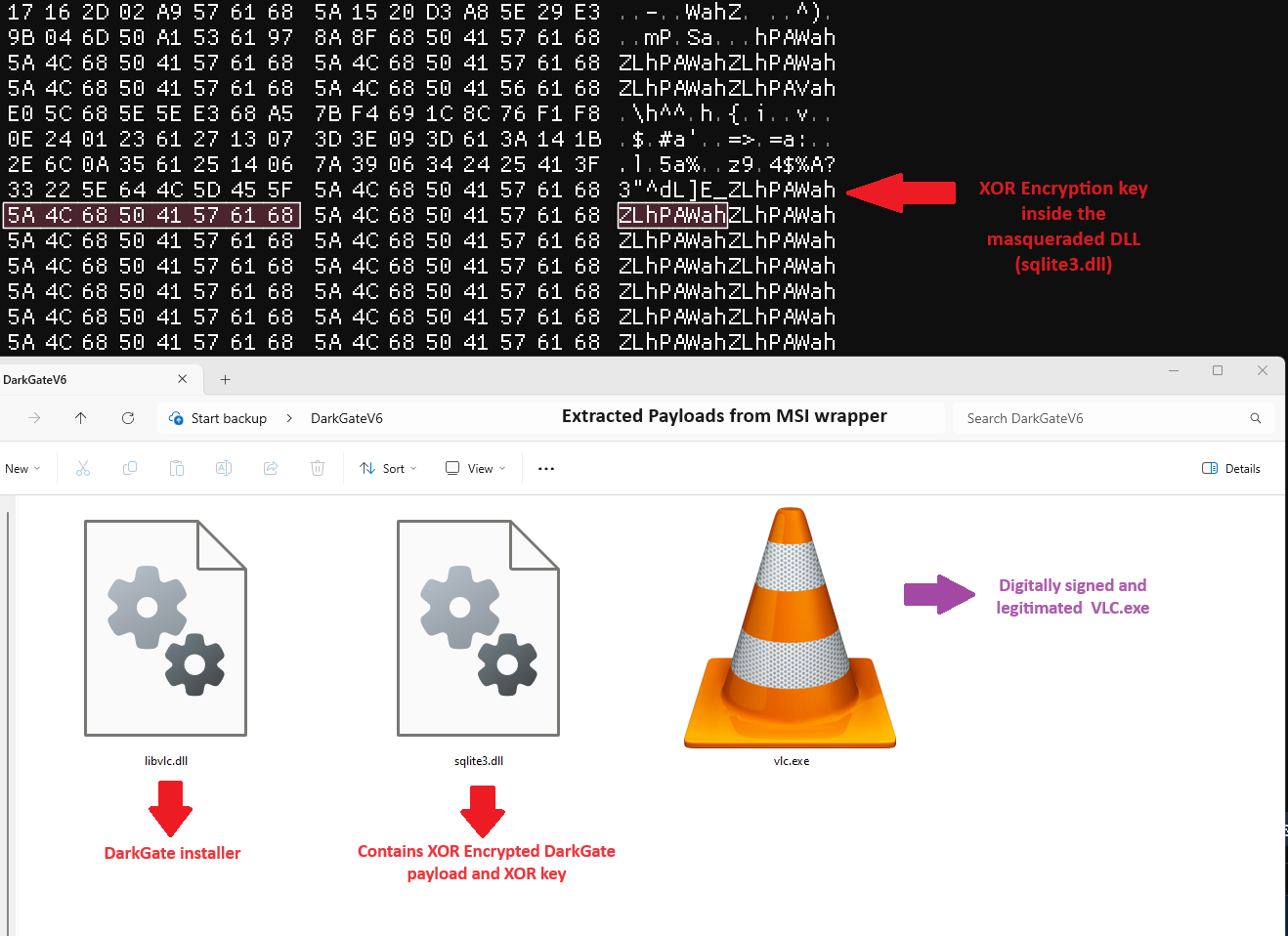 EclecticIQ analysts reverse engineered the downloaded MSI installer that contains wrapped DarkGate payloads. Evidence in figure 10 suggests that DarkGate version 6.1.6 started to leverage DLL side loading technique for evasion. To achieve this, the threat actor abused various digitally signed legitimate binaries such as VLC and iTunesHelper. Execution of MSI installer loads the malicious DLL into digitally signed legitimate binaries, which is causing the execution of final DarkGate payload.