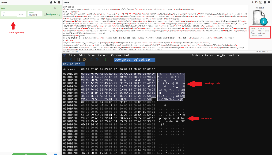 EclecticIQ analysts decrypted the final DarkGate payload by using one-byte XOR key “i” inside the script.au3. The previous version of DarkGate used the last 8 bytes of the AU3 file as an XOR key [9] and MZ header was not stripped.