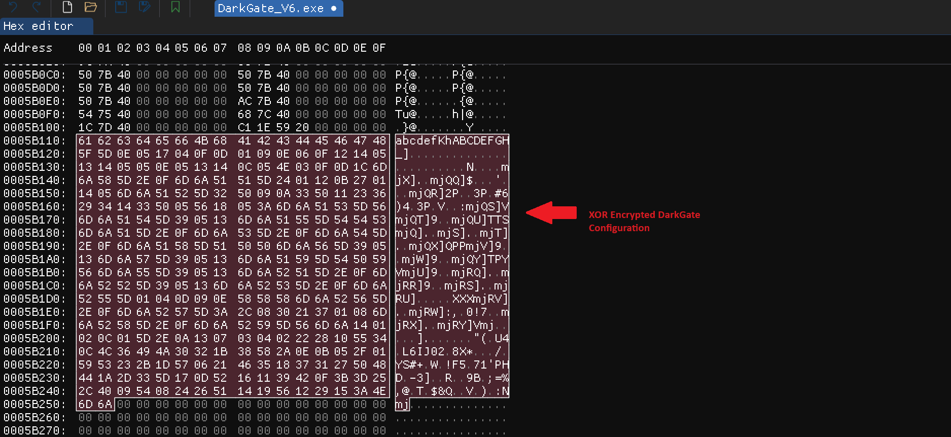 EclecticIQ analysts reverse engineered the final payload of DarkGate version 6.1.6, and uncovered a new configuration decryption routine. This routine decrypts the configuration at execution time using encrypted configuration data and an XOR key '60', both of which are stored within the payload itself, as illustrated in figure 14.