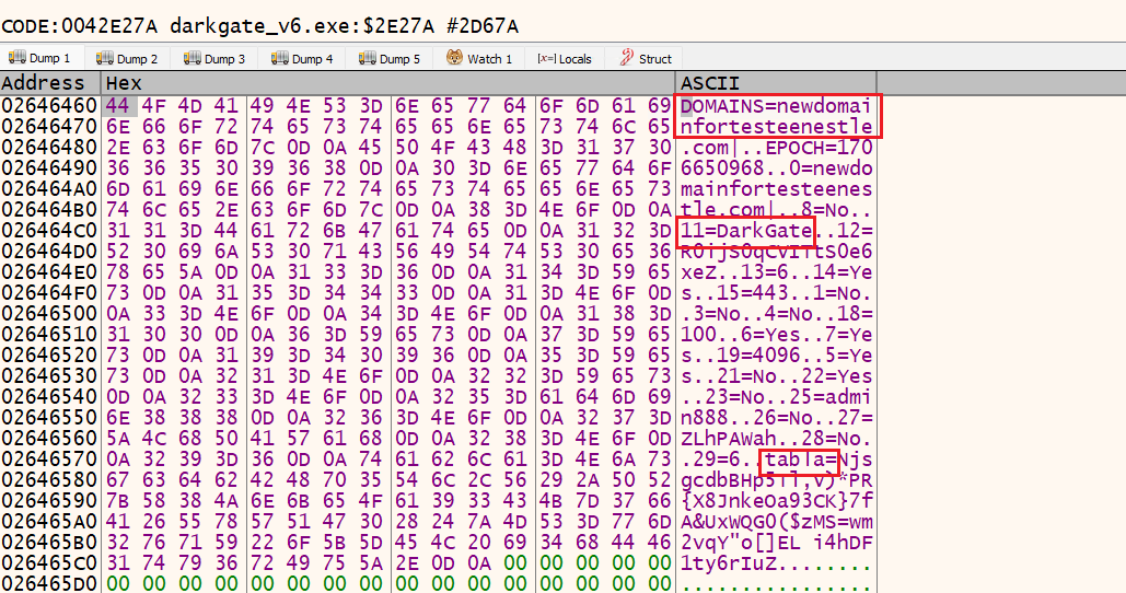 DarkGate version 6.1.6 configuration data shows that developers changed some of the numbering sequences that was previously observed in version 5 variant and added new fields such as DOMAIN, EPOCH and tabla. Appendix A shows the meaning of the number sequences.