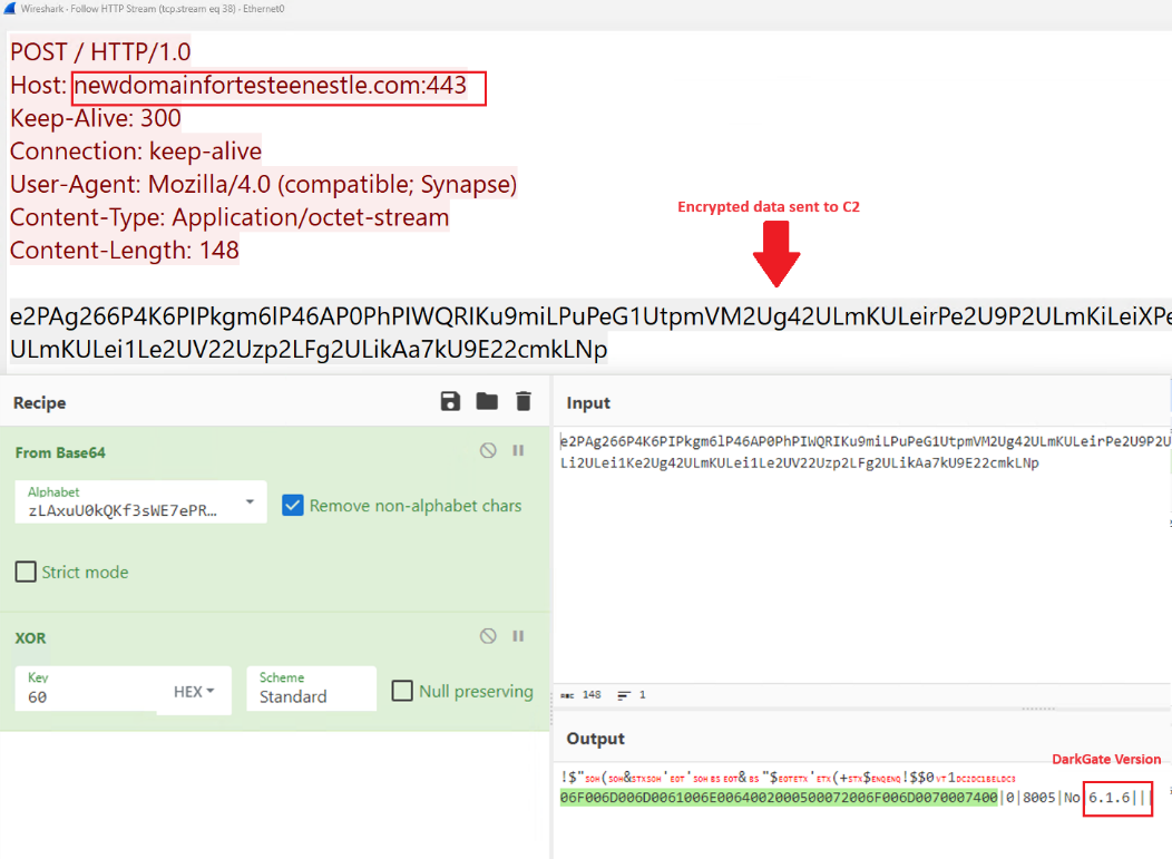 The configuration data in DarkGate sets various features and operational parameters, like the command-and-control (C2) server and port number. The threat actor configures these during the payload build phase. The developer of DarkGate utilized this technique to circumvent string-based detection and evade basic anti-malware scanners. Now, a list of C2 addresses is directly accessible in the configuration settings, in previous versions, the C2 URLs were stored separately and decoded by Base64 with custom alphabet.