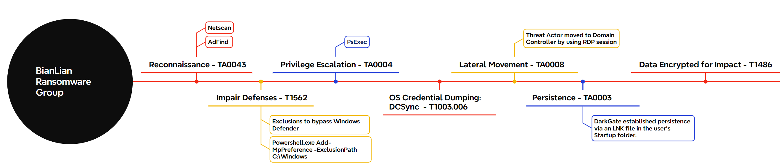 Human-operated ransomware attacks typically focus on encrypting as many devices as possible to increase the chances of securing ransom payments from victims. Figure 17 provides an overview of the post-exploitation tools and tactics, techniques, and procedures (TTPs) that BianLian affiliates, utilizing the DarkGate loader, employed in this intrusion.