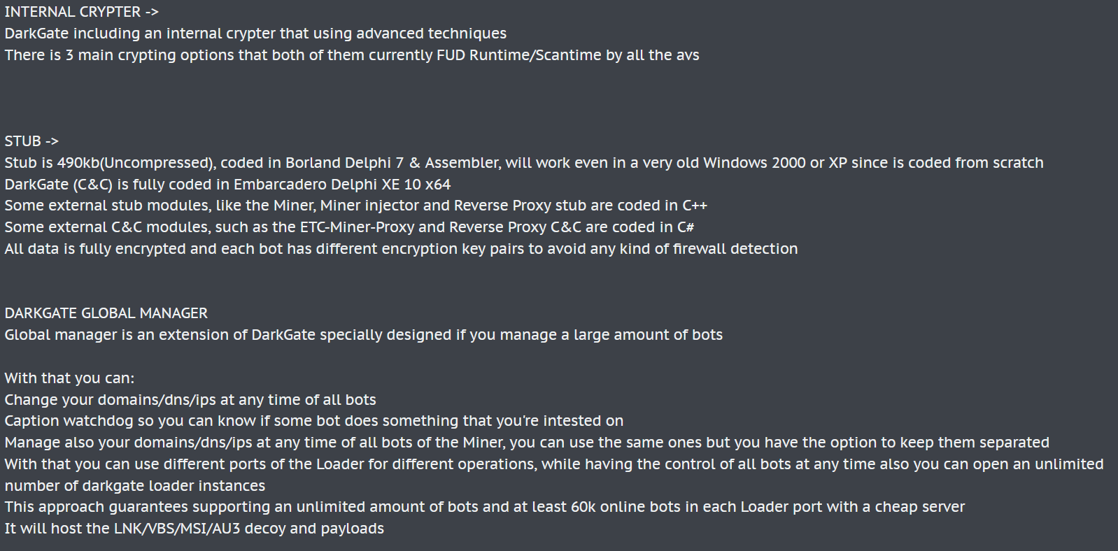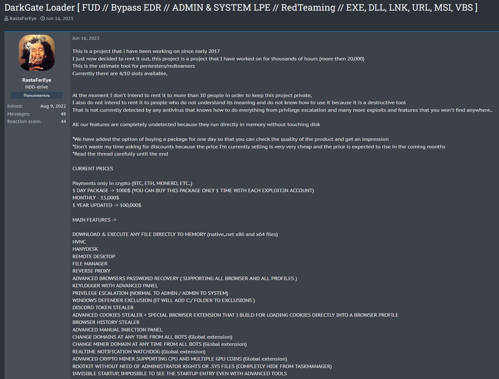 On June 16, 2023, the online persona RastaFarEye advertised the DarkGate Malware-as-a-Service (MaaS) on Russian and English-speaking cybercrime forums. DarkGate includes features such as hidden virtual network computing (hVNC) allowing threat actors to remotely control victim device, a user interface for data exfiltration, browser info-stealers, keylogger, and a rootkit module.