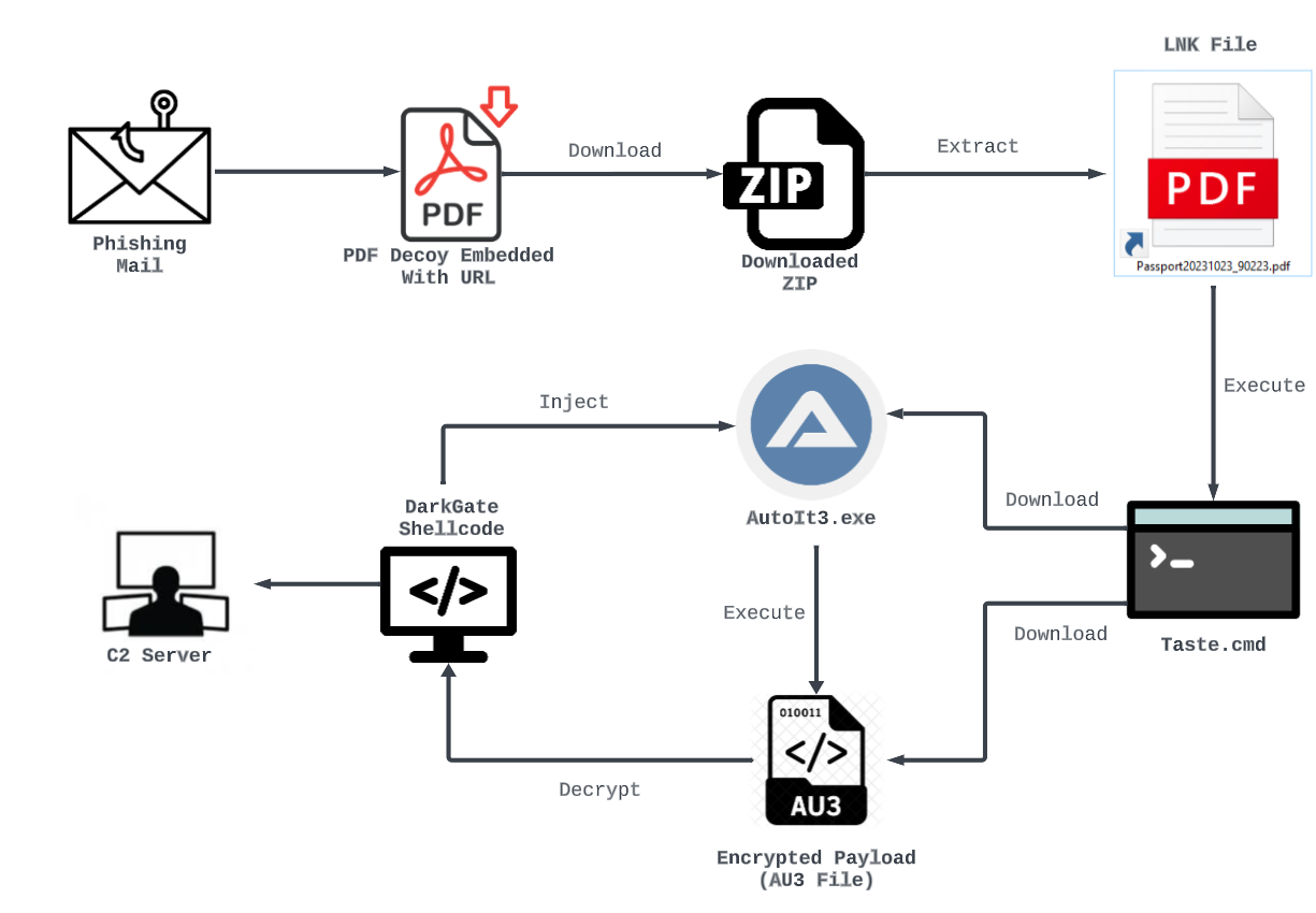 DarkGate campaigns primarily leverage phishing emails containing links or attachment to distribute the initial infection. Figure 4 shows an example of an infection chain that contains multiple layers of execution to achieve evasion against security solutions.