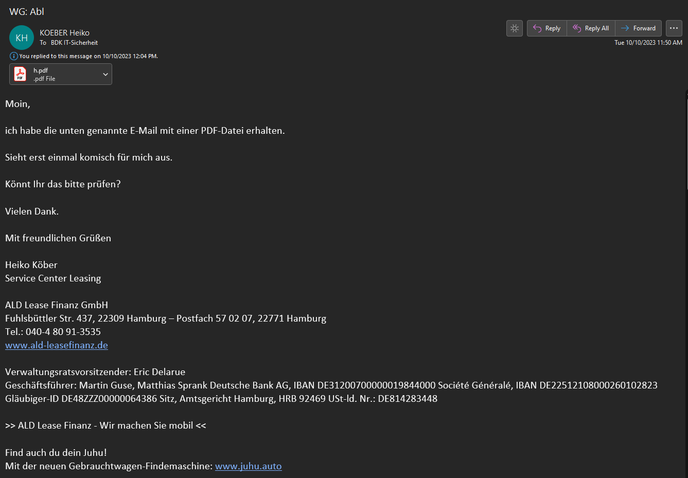 EclecticIQ analysts assess with high confidence that DarkGate operators predominantly target financial institutions. Figure 6 shows an email where a threat actor targeted the German based “Bank Deutsches Kraftfahrzeuggewerbe (BDK)” with a malicious PDF using an automotive-themed lure. BDK ranks as the second-largest independent bank in Germany's automotive and leisure vehicle sector [4].