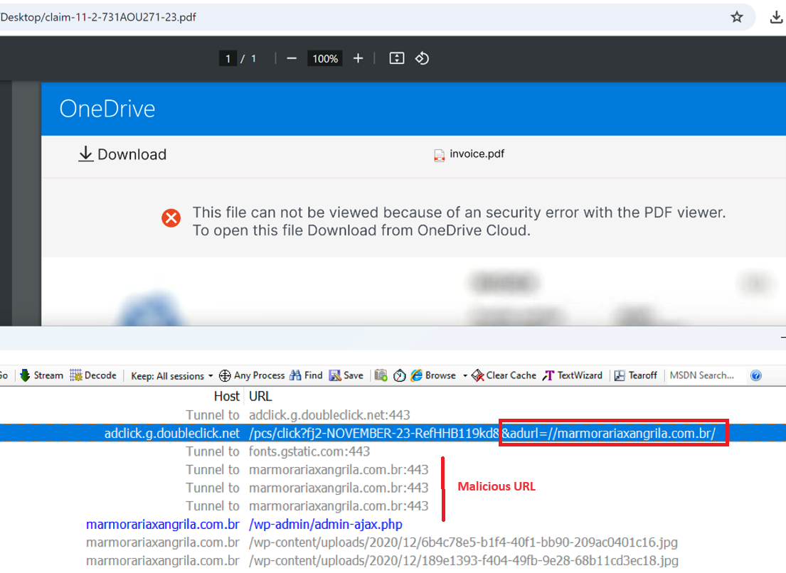 These emails often include PDF attachments, crafted to appear as invoices or billing documents from well-known sources like Adobe Acrobat Sign and OneDrive. The PDFs contain links to the Google domain adclick.g.doubleclick[.]net. However, upon clicking, it redirects victims to a malicious domain controlled by the attacker, which then delivers the DarkGate payload in CAB file format. Threat actors use this method mainly to bypass email gateways.