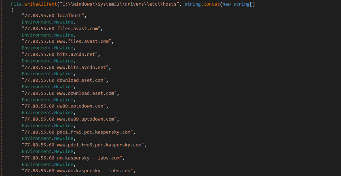 Key Group ransomware is capable of disabling updates from various anti-malware solutions by modifying the hosts file inside the Windows OS. Figure 11 shows targeted anti-malware solutions and a redirect to 77[.]88[.]55[.]60 – a legitimate Yandex RU servers. In addition, traffic is redirected to localhost which means it will be dropped, effectively disabling anti-malware updates.