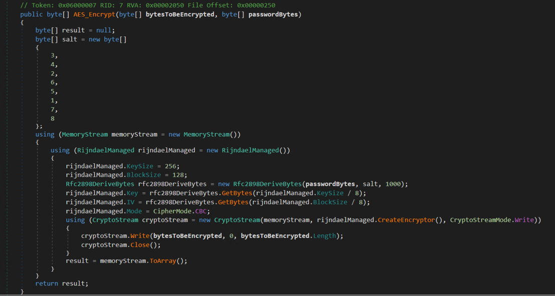 - Password Derivation: The code uses the Rfc2898DeriveBytes class to derive the encryption key and IV from the provided static password and salt. The 1000 parameter specifies the number of iterations to use in the PBKDF2 algorithm, which helps make brute-force attacks more difficult.