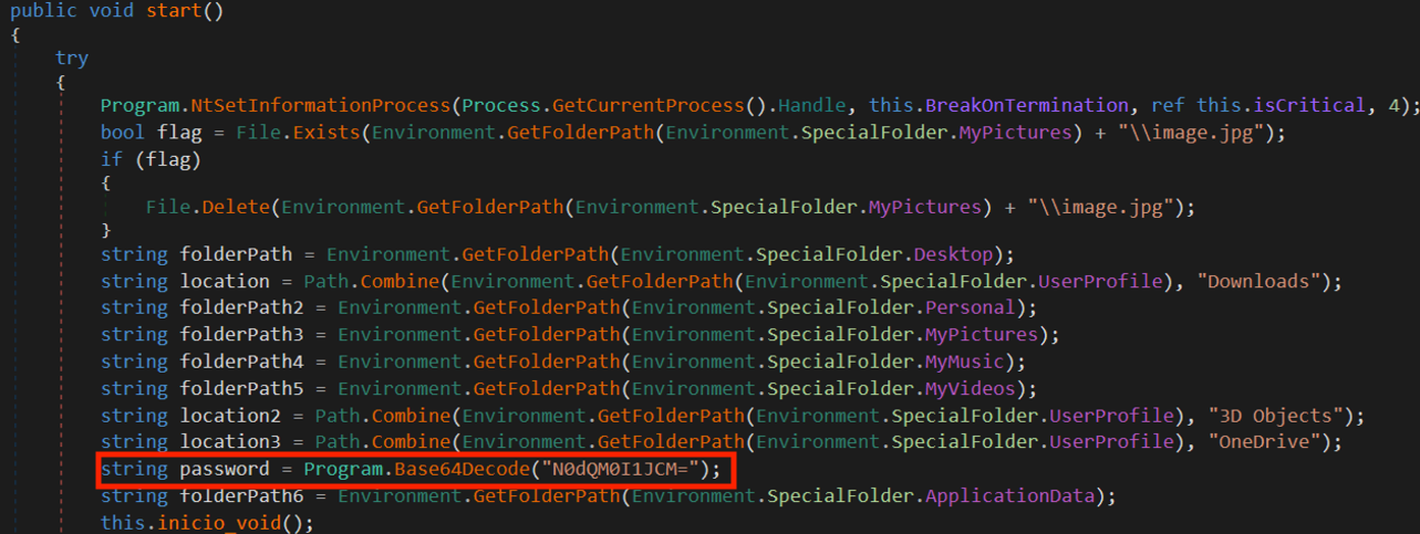 Figure 5 shows the AES_Encrypt function. This function encryps victim data using the AES algorithm in Cipher Block Chaining (CBC) mode with a given static password. The password is derived from a key using the Password-Based Key Derivation Function 2 (PBKDF2) with a fixed salt.