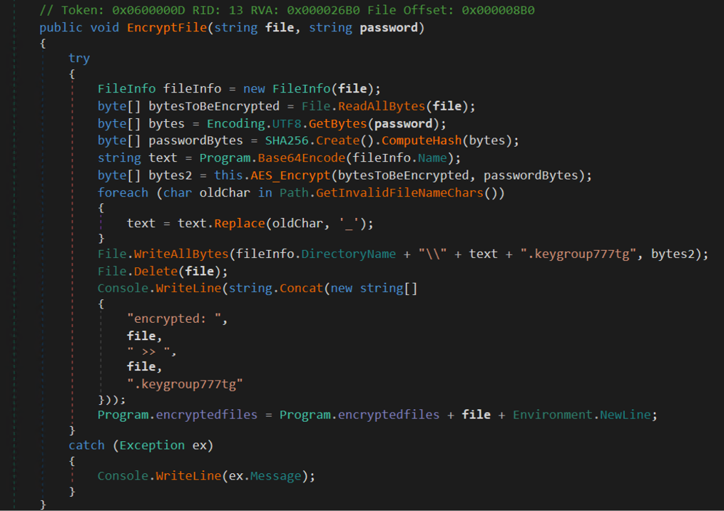 Figure 6 shows the EncryptFile function. It encrypts a file with a given password and saves the encrypted content with a new extension .keygroup777tg.