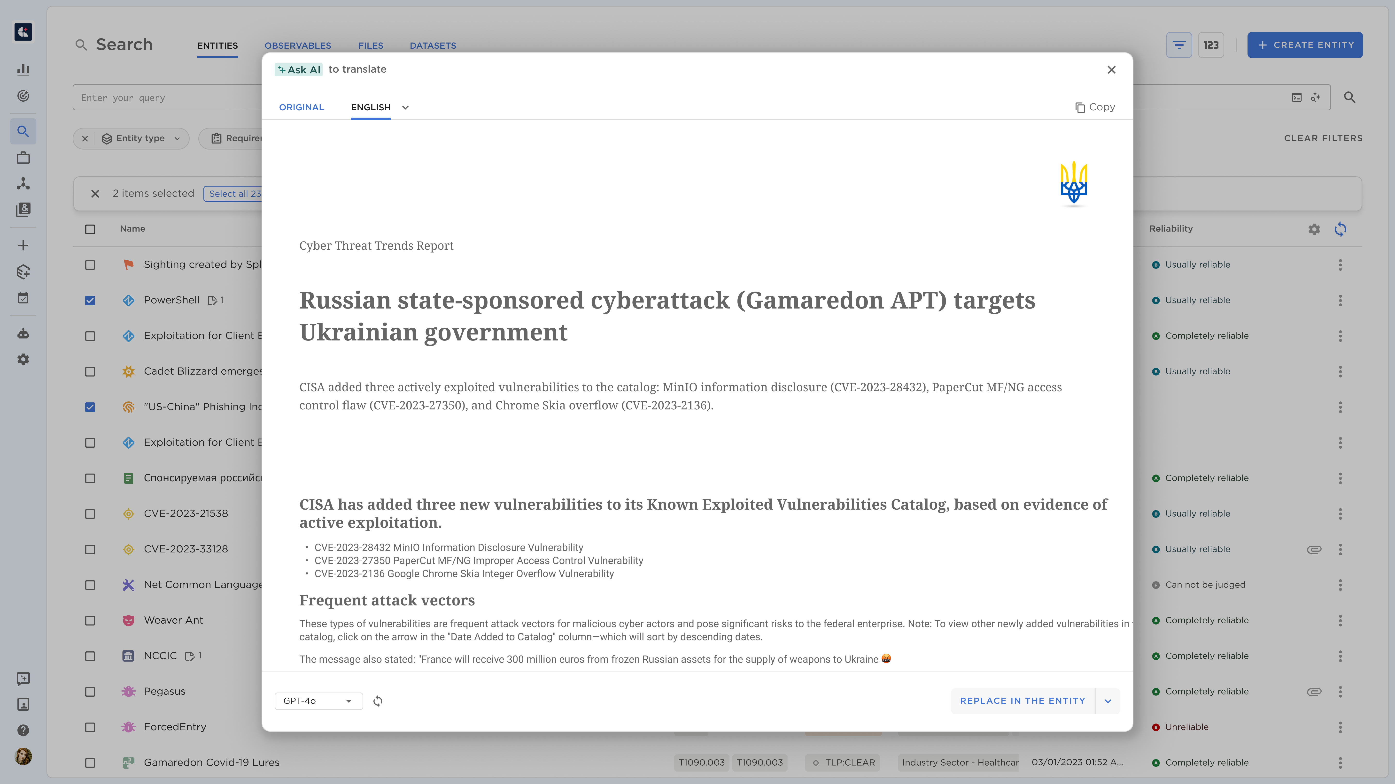 Threat reports are too long. Intel from overseas is often locked behind language barriers. And there’s rarely time to read every source deeply, especially when you're under pressure to deliver answers. Maybe you’re trying to make sense of a 27-page malware analysis, a Chinese-language CERT advisory, or a dark web post in Russian - all before your first incident meeting. Manually translating or skimming just to decide if something’s relevant? That’s time you don’t have, and when you’re forced to switch between tools to summarize, translate, or structure content, you lose focus and slow down right when speed matters most.