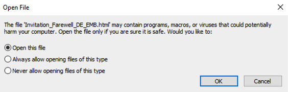 EclecticIQ analysts identified two malicious PDF documents that masquerade as coming from the German embassy, and that targeted diplomatic entities with invitation lures. The documents used the following themes: “Farewell to Ambassador of Germany” and “Day of German Unity”. The first PDF contained embedded JavaScript code to deliver multi-staged payloads in HTML file format. PDF readers like Adobe Acrobat have a default setting that warns before execution of code inside a PDF document. Upon user execution the PDF document displays an “Open File” alert box (Figure 1). If a victim opens it, the code will launch the malicious HTML file called Invitation_Farewell_DE_EMB.
