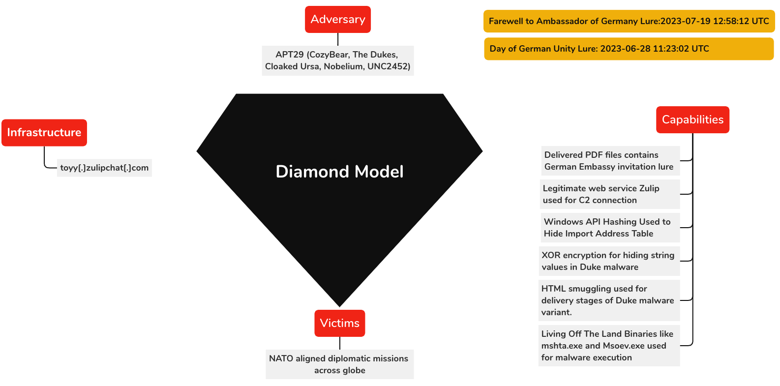 EclecticIQ Analysts assess with high confidence that the identified pdf documents are part of a wider campaign targeting diplomatic corps across the globe. Victimology, themes of the phishing lures, malware delivery and the malware itself resemble with OSINT reports that attributed the campaign to APT29. [1 [2