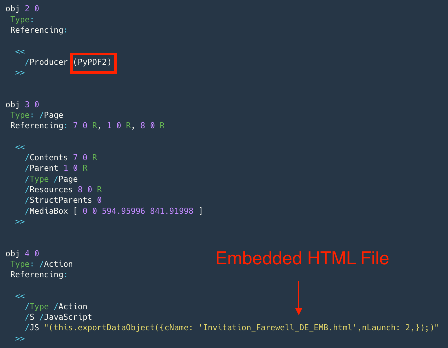 Figure 3 shows the embedded JavaScript code inside the German embassy invitation lure PDF, which was generated by PyPDF2. [3]