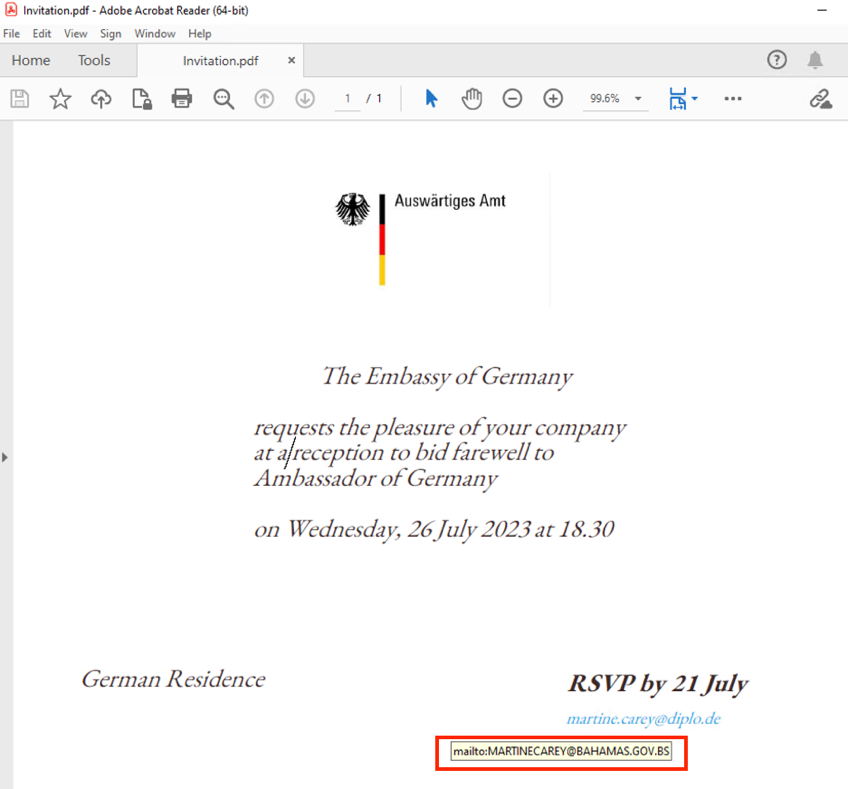 Figure 2 shows the German embassy invitation lure. The mailto address inside the PDF file refers to a legitimate domain bahamas.gov.bs. Analysts observed the same domain in a report by Lab52 from mid-July. [2] Lab52 initially reported a campaign impersonating the Norwegian embassy and targeting diplomatic entities with invitation lures.