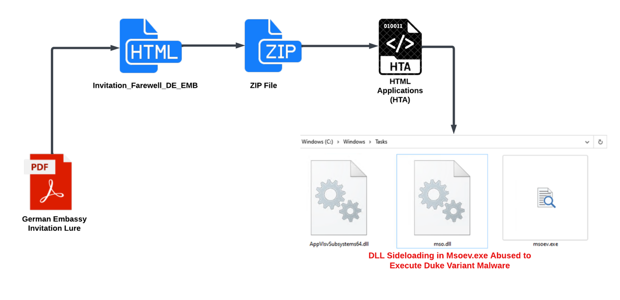 Invitation_Farewell_DE_EMB is an HTML file. Through HTML smuggling, the threat actor delivered a ZIP file that contained a malicious HTML Application (HTA). An HTA file is a widely used Living Off The Land Binary (LOLBIN) containing both HTML and scripting code to create a standalone malicious application that is executed by the Windows HTA engine mshta.exe [4]. The zipped HTA file eventually delivers a Duke malware variant (Figure 4).