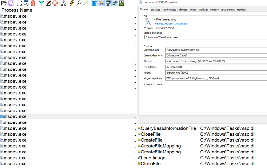 Figure 6 – DLL Sideloading attempt into Msoev.exe.