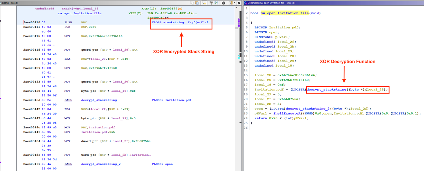 Analysts observed that all string values are encrypted by generic XOR encryption routines that are decrypted at execution. Figure 8 shows an example of a decrypted function inside the mso.dll, which is used to open the lure Invitation.pdf. The malware uses ShellExecuteA Windows API to open the PDF lure document. String data such as Invitation.pdf is stored statically inside the malware as XOR encrypted stack string.