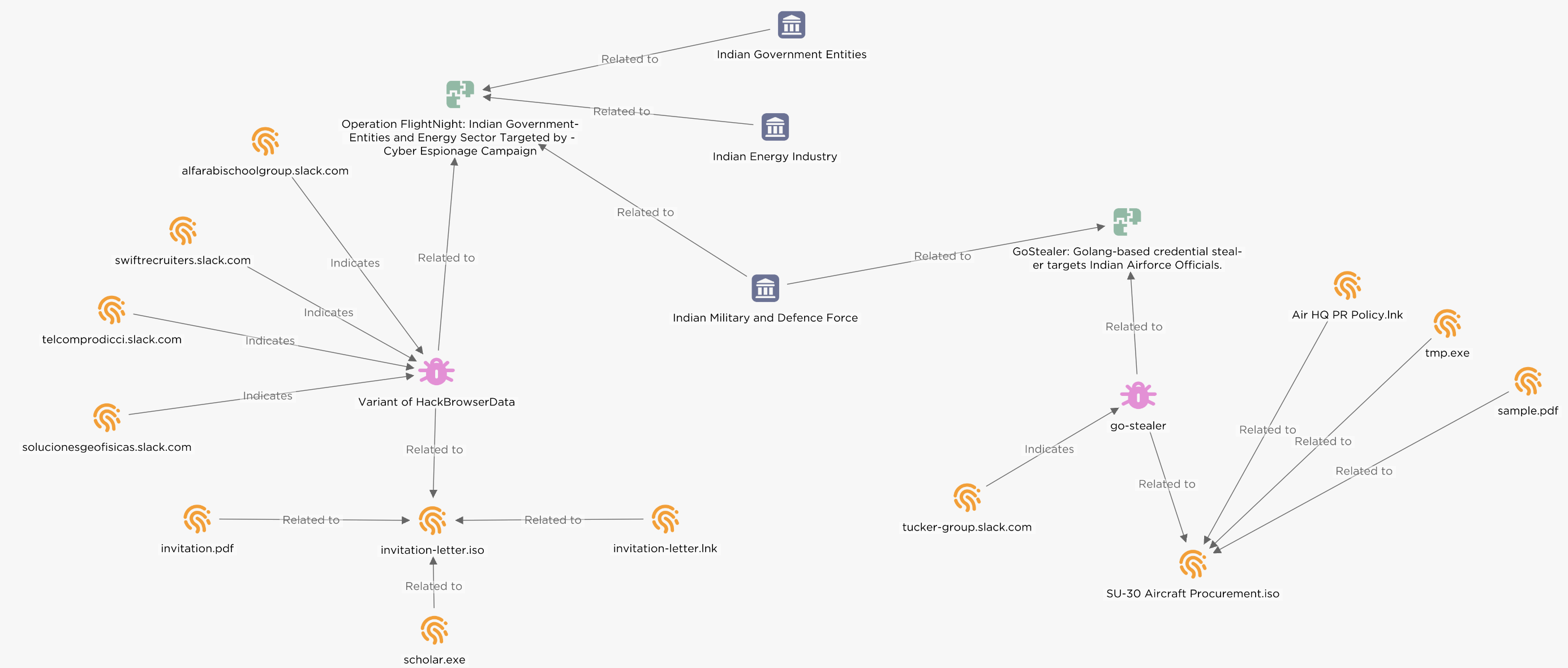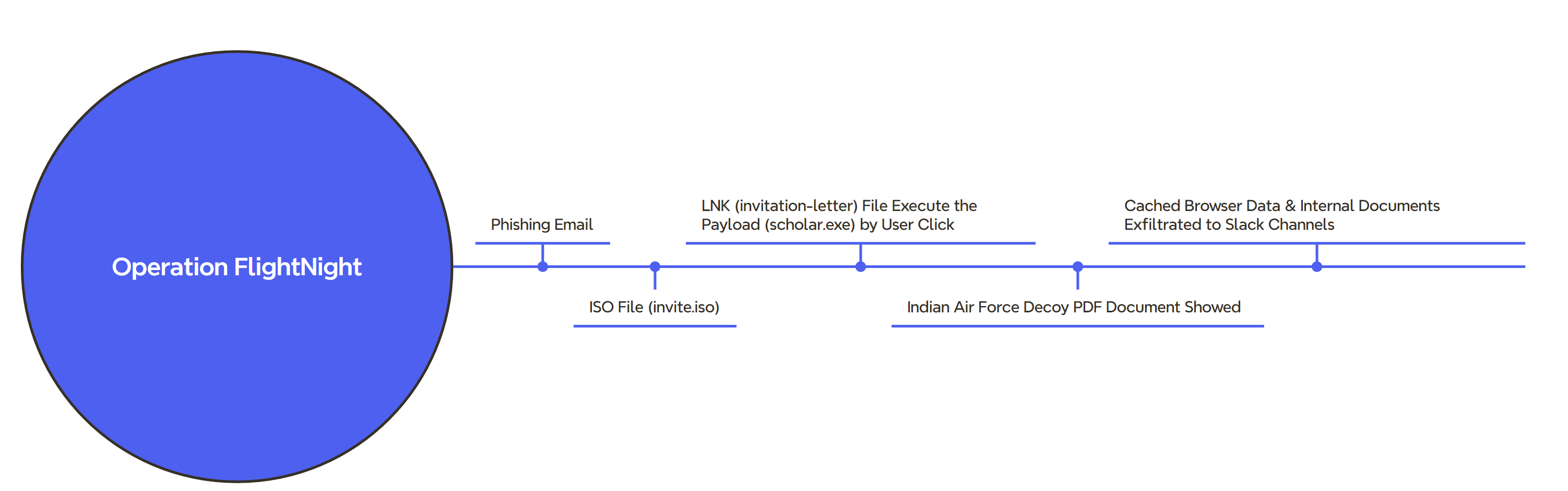 The information stealer was delivered via a phishing email, masquerading as an invitation letter from the Indian Air Force. The attacker utilized Slack channels as exfiltration points to upload confidential internal documents, private email messages, and cached web browser data after the malware's execution. EclecticIQ analysts dubbed the intrusion “Operation FlightNight” because each of the attacker-operated Slack channels was named “FlightNight”.