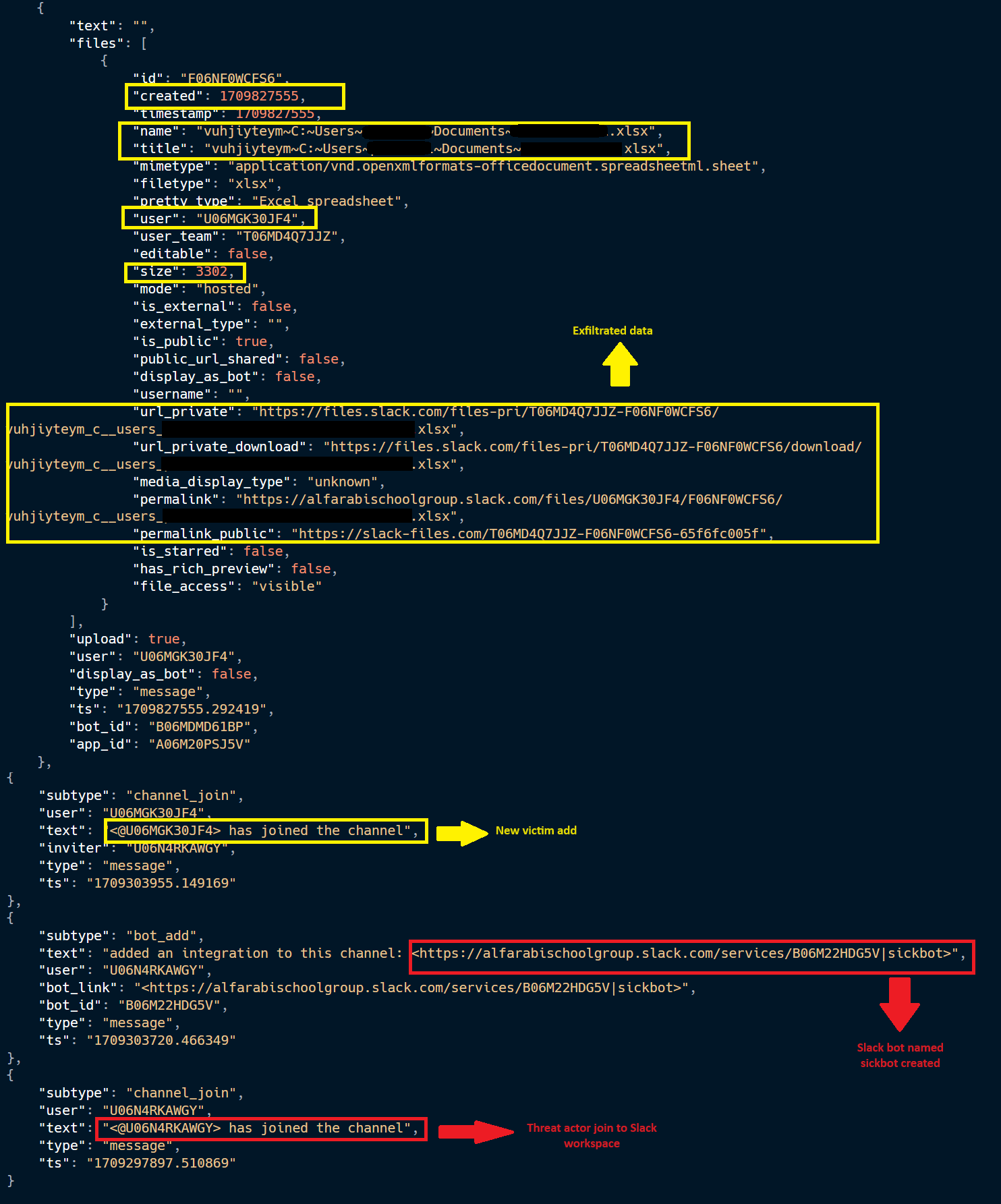 - Utilization of Slack Servers for Data Exfiltration: The actor abused Slack, a popular communication platform for businesses and teams, to steal data. By blending data exfiltration with legitimate Slack traffic, attackers effectively camouflage their activities. This choice reflects a move to exploit the trust and ubiquity of Slack in professional environments, reducing the likelihood of detection.