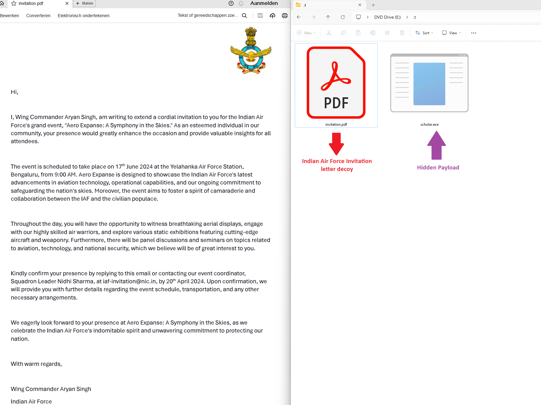 The threat actor used a decoy PDF document, pretending it was an invitation letter from the Indian Air Force. This document was delivered inside an ISO file, which contained the malware in an executable form. Additionally, a shortcut file (LNK) was included to trick recipients into activating the malware.