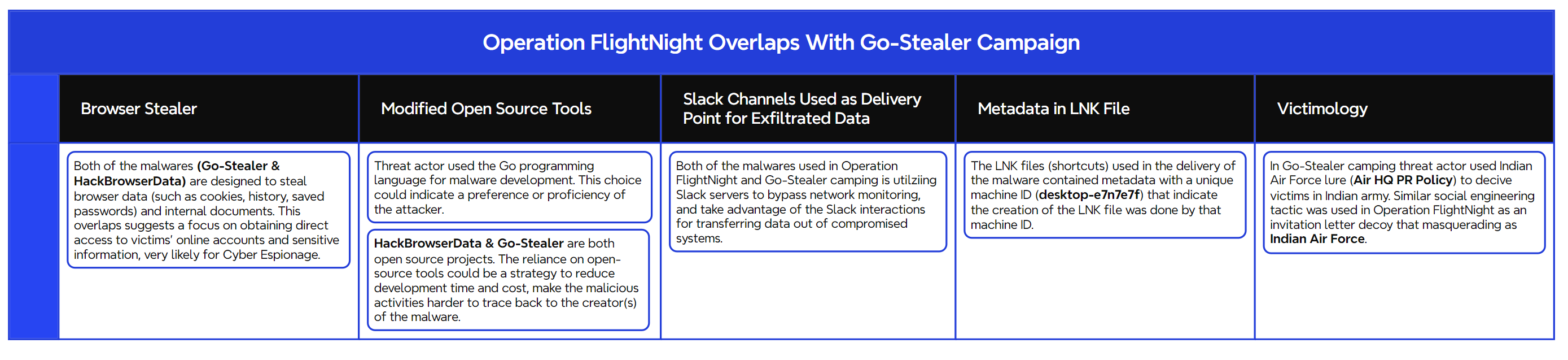 Figure 5 shows five different overlaps between Operation FlightNight and the Go-Stealer campaign that was previously observed by researcher ElementalX2 on January 17, 2024 [2]. This comparison highlights specific areas of overlap between the two different incidents, offering strong evidence that both campaigns are likely the work of the same threat actor targeting Indian government entities.