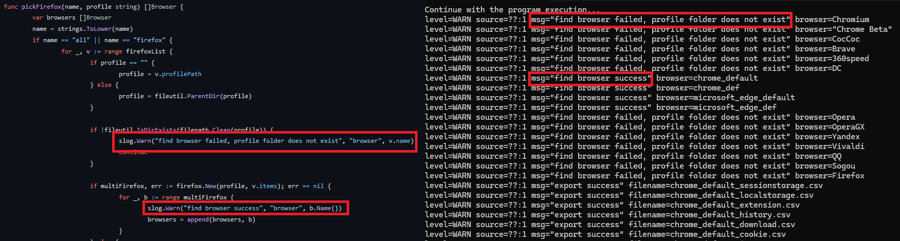 Figure 6 shows code similarities between the original HackBrowserData in the GitHub repository [4] and the modified variant that is used in Operation FlightNight. The right side of the image displays the modified version of the malware executing in verbose mode. While extracting cached browser data, it encountered error messages identical to those seen in the original HackBrowserData.