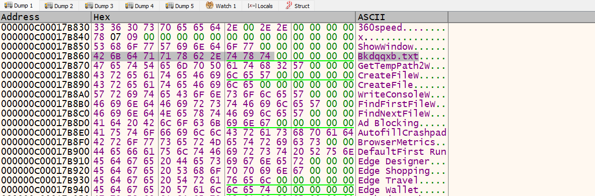 The malware creates a TXT file named Bkdqqxb.txt in the %TEMP% directory, and uses this file as a mutex to prevent multiple instances from running on the same host. This file name, along with Web Browser names are stored in an encoded format and it is decoded dynamically at the time of the malware's execution.