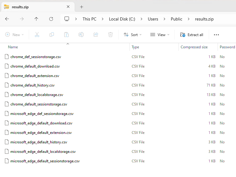 The cached web browser data was stored inside C:\Users\Public\results.zip file path. This file was sent to attacker-controlled Slack channels via files.upload API method [5].