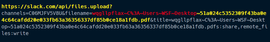During data exfiltration the malware is designed to target only specific file extensions, such as Microsoft Office documents (Word, PowerPoint, Excel), PDF files, and SQL database files on victim devices, very likely to increase the speed of the data theft. The malware starts to upload identified documents to Slack channels and finalize data exfiltration. Figure 9 shows network traffic during data upload to a Slack server. The threat actor uses the below structure to identify victims trough ID and username:
