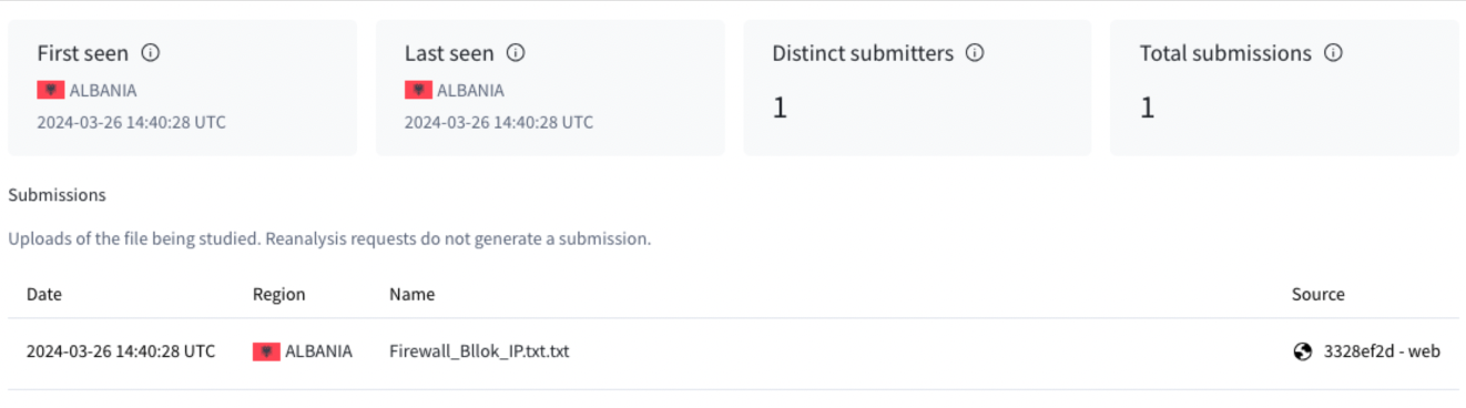 Analysis reveals the file is indeed a list of IP addresses in a plain text file. It is named “Firewall_Bllok_IP.txt.txt”. Every IP address within is currently listed as malicious, and all but one IP address are registered on multiple Antivirus vendors. The file has no further OSINT links, further suggesting authenticity.